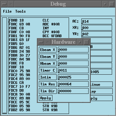 And there is an integrated debugger. which allows single stepping on either the instruction or raster level, along with processor and hardware register inspection/alteration.