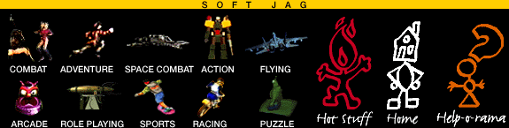 HOT STUFF | COMBAT | ADVENTURE | SPACE COMBAT | ACTION | FLYING | ARCADE ROLE PLAYING | SPORTS | RACING | PUZZLE | JAGWARE | ORDERING | HOME | HELP-O-RAMA