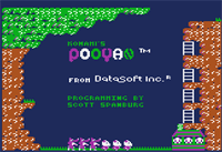 This is a good time to point out that in this stage there are 2 and 3-layered balloons. So it will take 1 or 2 more hits to burst their bubble. Each balloon is smaller and so it floats upward slower than the previous. Bonus Round #1: After clearing the first 2 levels, you get to the first bonus round. This plays much like the 2nd level, but now you cannot die. There are no rocks and no arrows. You are limited to throwing bait only this round, until it is all gone - thus ending the round. Bonus Round #2: A Surprise to me! Just before sitting down to complete this review, I had a great game, and discovered the existence of a 2nd bonus round. Now the wolves are sitting in the greenery all up and down the far left side. They throw their rocks at you from different heights, and you score bonus points for hitting as many as possible with your arrows. I am fairly certain that you cannot die here, as I did not try. Bonus Round #3 ?: Well . . . There may be one, but it'll take a lot of patience and an outstanding score to get that far. Later levels: Beyond the first 2 levels, the Wolves carry along a shield to protect themselves. You now have to hit their shield and then the balloon to drop them. Points are scored for every balloon popped, every wolf dropped, and every rock intercepted. Even further along, they start throwing the rocks at an angle. This makes it even harder to stop them that when they throw them straight at you. For the 8-bit Atari, Pooyan is only available in disk format. More specific details are: Controls, Gameplay, Graphics, Sound, and Addictiveness. Control: The Controls are very good. Up/Down and fire button, may seem very simple, but there is quite a lot involved in this cute game. Gameplay: The Gameplay is very involved. I am not sure if any thing is missing from the arcade, but certainly nothing more is found in the Atari 2600 or C64 versions. I did not discover a pause feature, but I must admit that in a rush to get this review done, I did not search the manual archives. Extra lives are scored at every 50,000 points. Fewer balloons run interference than on the other 2 home version. Graphics: not great, but certainly no drawbacks here. Sound: The Sound and music are nice, but somewhat annoying to my wife. This is one of those games that could almost be played without any sound. Addictiveness: Oh yes this is an addictive game. I can't wait to get back to playing it - to see if there is a 3rd, or more bonus rounds. It will take quite a bit of play to learn all the tricks you need to make it as far as I have - but I am sure that you can. Hopefully this will get you to try Pooyan, and see if there are more bonus levels. Atari 8 bit Designer: Scott Spanburg, Datasoft |