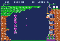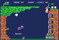 Pooyan may at first appear to be a silly game - pigs fighting back against wolves - but it will grow on you. Given a chance, you should see that there is quite a bit going on in this game; lots of skill, strategy, and hand-eye coordination are involved. You are the mother pig, trying to rescue her Pooyans, baby pigs. Warning :-) There is some mild violence involved, as the pig and wolves, when hit, will plummet to their death - ending with a splat. There are 2 different levels in Pooyan, and at least 2 different bonus levels as well. All of these levels use the same screen layout, with minor changes from one to the next. Level 1, Pig's House, but I call it "Droppin In": At the top of the screen, 1 to 4 wolves promenade in from left to right and at some point, grab a balloon, and jump off the edge of the cliff. This cliff extends nearly all the way to the far right, but not quite. A small gap there is what saves the pigs from being eaten in the first place - and then we'd have no video game challenge. The pigs are stationed at the top right of the screen, but have at their defense an outdoor basket elevator, which they use quite to their advantage. The Mother pig uses this to go up and down the right side of the screen, and she can fire an unlimited supply of arrows at the wolves. When the wolves drop off the edge of the cliff they don't simply descend to the ground, they fire rocks (look like big Cocoa Puffs) trying to hit the Mother pig. If she gets hit, she falls out of the basket as well . . .. and gravity sucks.