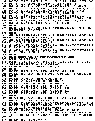 The program begins by POKEing the fill routine into page 6. Buffers which store the coordinates of points plotted by the fill routine are defined, and their locations in memory are POKED for the fill routine to use. Then Graphics 10/7 is set up.