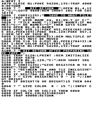 The subroutine at Lines 4030 to 4070 can be used in another program to load a picture from disk, if the user provides the file name in Line 4030. If the cassette is used, then Line 4030 should read: