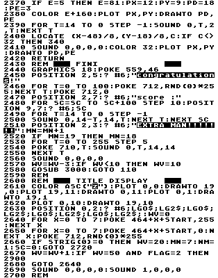 One of the best ways to learn about how to make your own games is to analyze other people's games. When you finish typing in this game, improve it! Change it! Learn it! That's how I learned to make games.