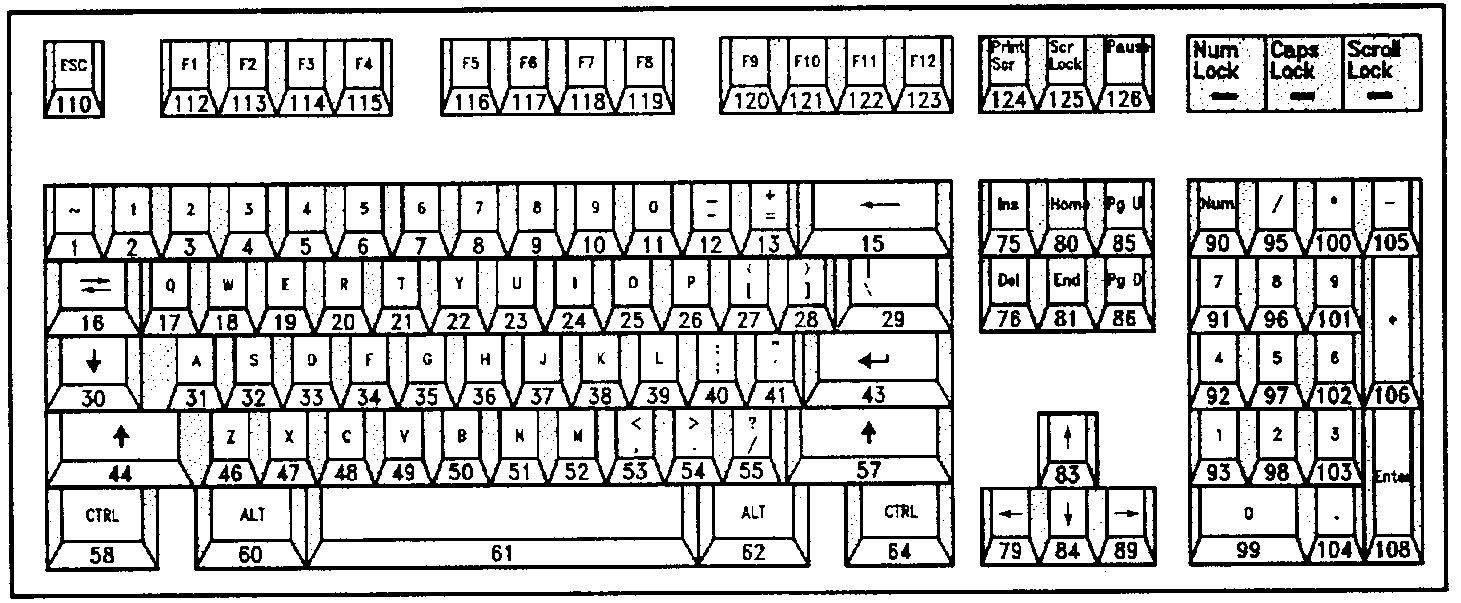fig. 8: PC-MF2-standardkeyboard (english Version, keys 42 and 45 added on german layout)