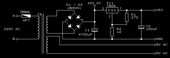 podaję schemat prostego zasilacza do komputera COMMODORE 64. Schemat zasilacza fabrycznego