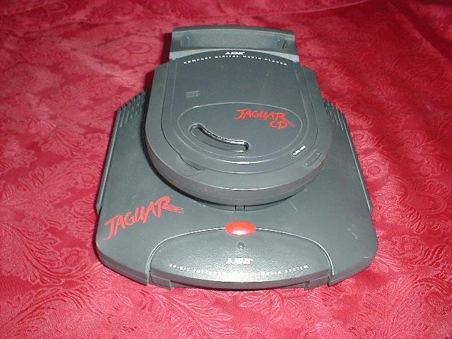 Zdjęcie przedstawia konsolę Jaguar z zamontowanym modułem CD-ROM.