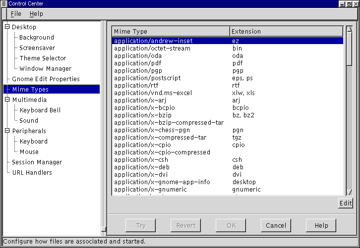 The GNOME Mime Types Capplet allows you to determine how you wish to handle certain file types, or Mime types. Mime stands for Multipurpose Internet Mail Extensions and was originally developed to allow email to carry various forms of data. In GNOME you can define certain Mime types to be handled in any manner you wish. For example, if you use .sgml files frequently and you wish to always use Emacs to edit them you can configure the .sgml Mime type to always be handled by Emacs. This means that any program that wishes to launch the mime type for you will bring up Emacs. This includes double clicking on the file type in the GNOME File Manager.