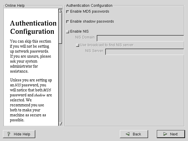 Unless you are setting up NIS authentication, you will notice that both MD5 and shadow passwords are selected (see Figure 4-14). We recommend you use both to make your machine as secure as possible.