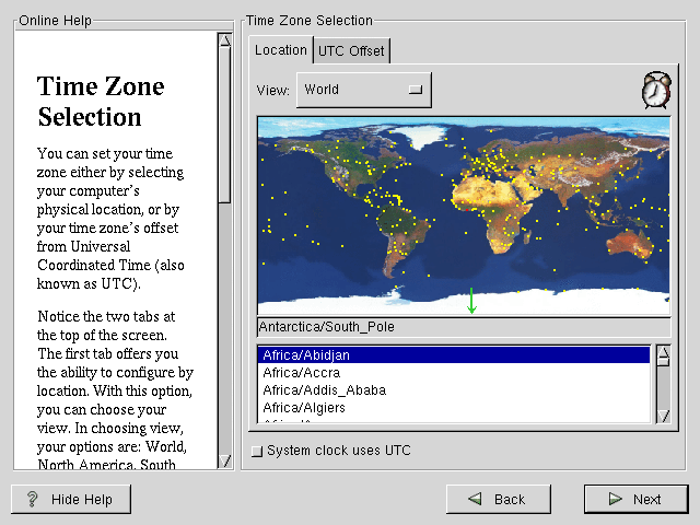 You can set your time zone either by selecting your computer's physical location, or by your time zone's offset from Universal Coordinated Time (also known as UTC).