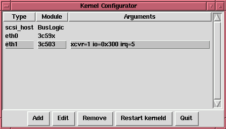 The changes that you make with the Kernel Daemon Configuration tool will be made in the /etc/conf.modules file, which kerneld reads whenever it is started. Once you have made changes, you can restart kerneld by clicking on the Restart kerneld button. This will not cause any modules which are currently in use to be reloaded, it will only notify kerneld to use the configuration when it loads more modules in the future.